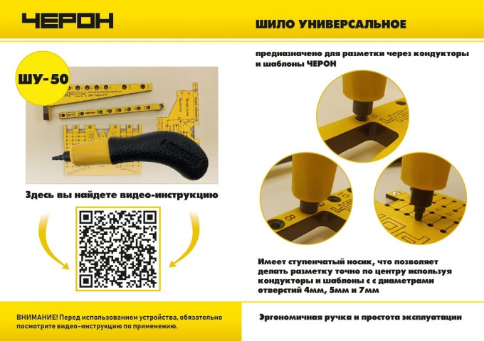 12. ШУ-50 Служит для разметки через кондукторы и шаблоны. Имеет ступенчатый носик под диаметры 4, 5, 7 мм. Разметочное устройство с различными диаметрами носика позволяет точно разметить отверстия на деталях через кондукторы и шаблоны.