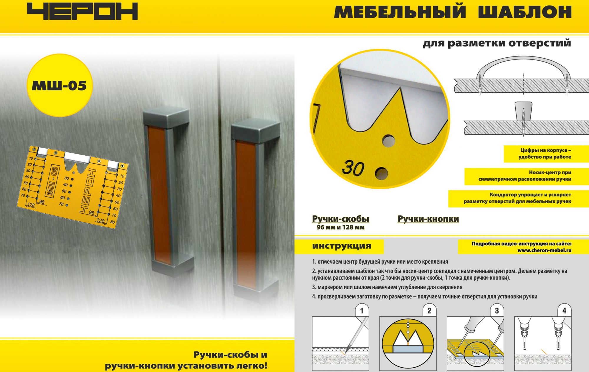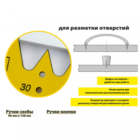 МШ-05, шаблон для разметки отверстий под мебельные ручки-кнопки и ручки-скобы (96 мм и 128 мм)