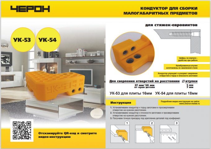 1. УК-53 Кондуктор для сборки малогабаритных предметов: Этот инструмент предназначен для сверления плит лдсп в торец и плоскость под евровинт (конфирмат). Имеет втулки 5 и 7 мм. и сочетает в себе две системы 25/50 и 32мм.